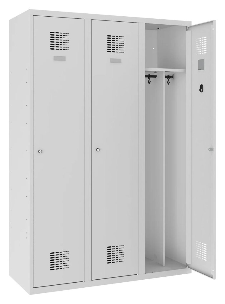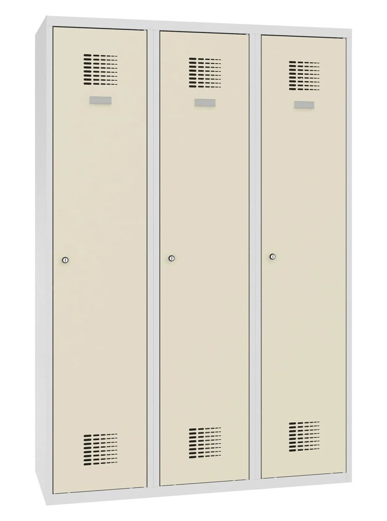 Three-door wardrobe with welded construction and modern ventilation system design. Height 1800 x width 1200 x depth 500 mm. Standard cabinet equipment: internal partition for separating clean and dirty laundry, rod with two hooks, towel hook, mirror, shelf above the rod, self-adhesive name tag. Cylinder lock or padlock closure.