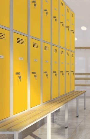 Six-door metal wardrobe with bench and modern ventilation system design. Height 2190 x width 900 x depth 500 mm. Standard equipment: bar with hooks, self-adhesive name tag. 16 color shades to choose from included in the price without extra charge. Different types of locking.