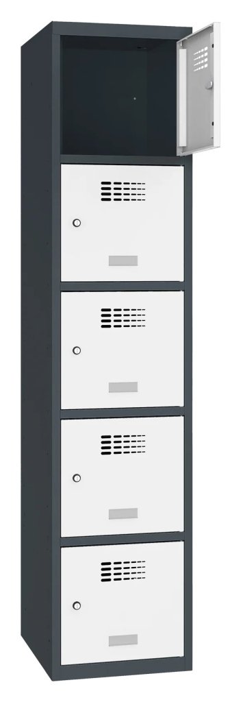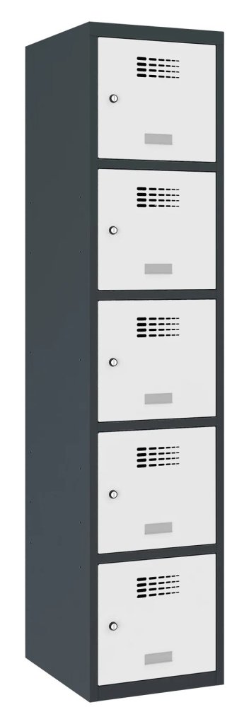 Five-door wardrobe with welded construction and modern ventilation system design. Height 1800 x width 400 x depth 500 mm. Self-adhesive name tag on the door. 16 color shades to choose from. Cylinder lock or padlock closure.