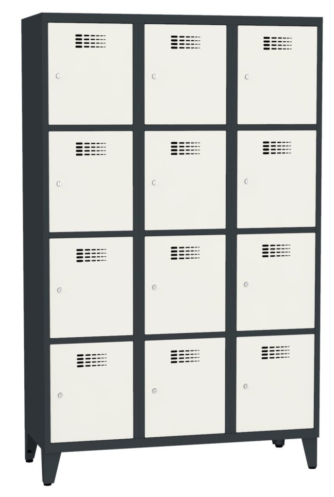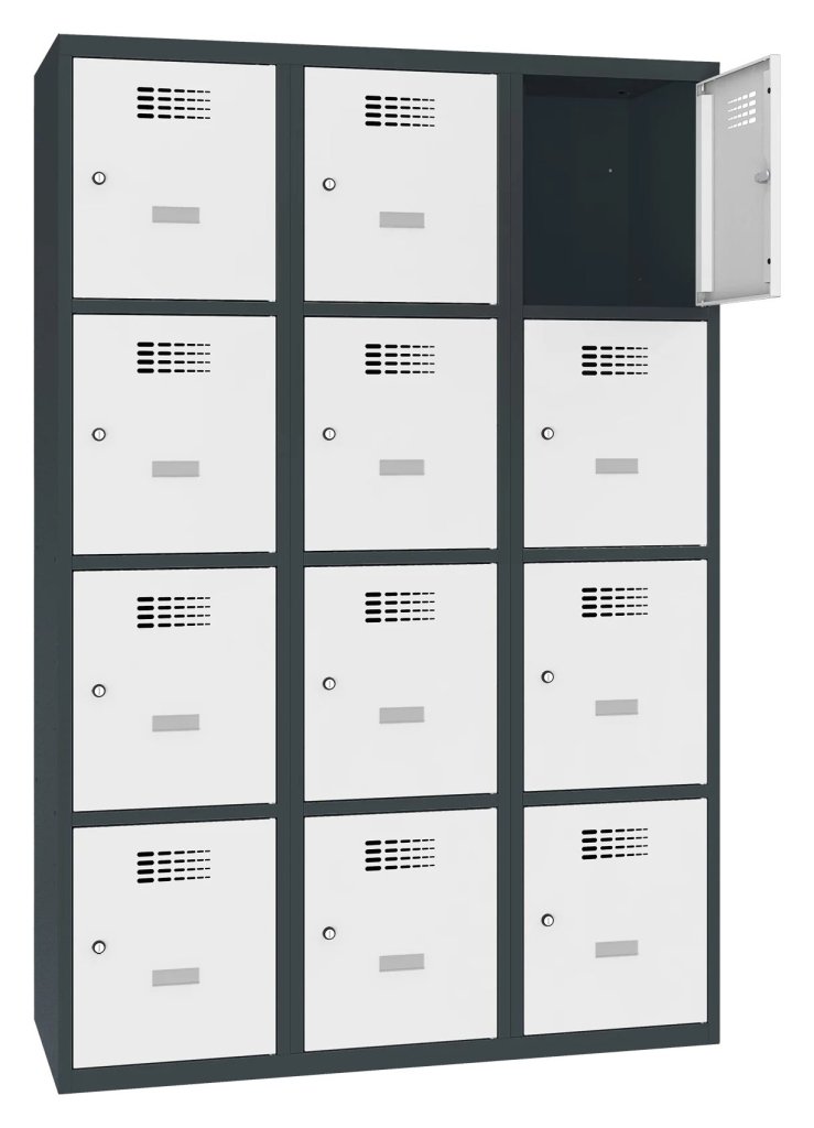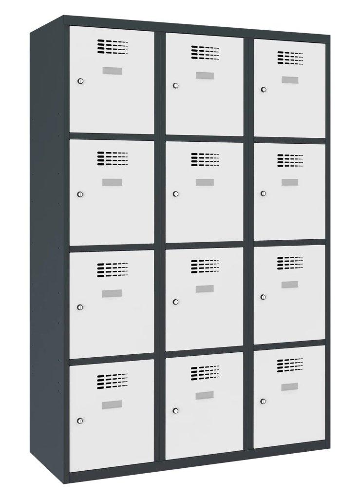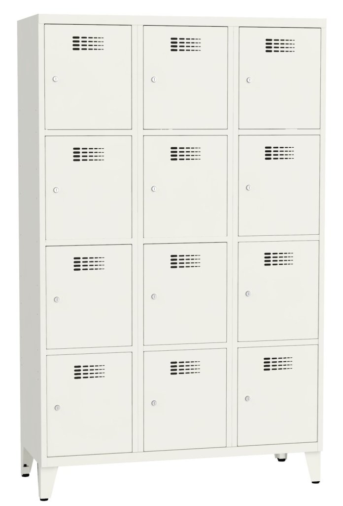 Twelve-door wardrobe with welded construction and modern ventilation system design. Height 1800 x width 1200 x depth 500 mm. Self-adhesive name tag on the door. 16 color shades to choose from. Cylinder lock or padlock closure.