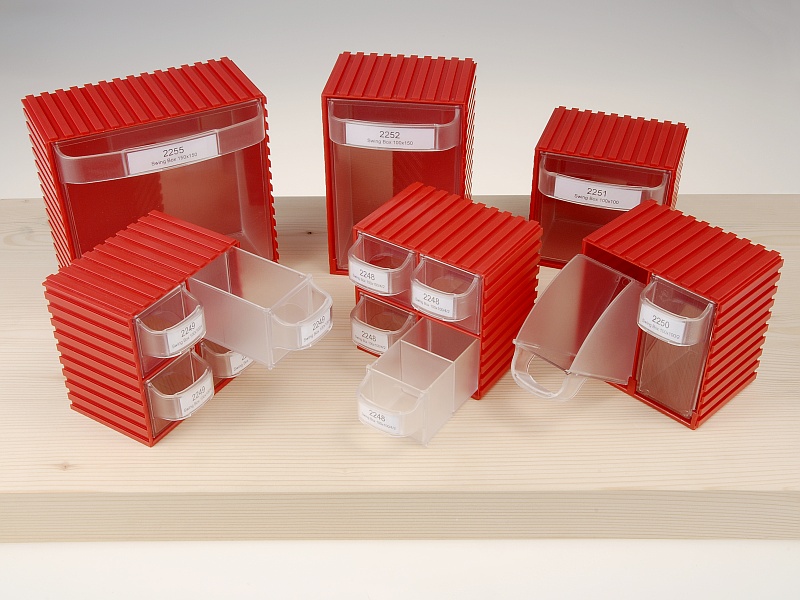Swing Boxes are hinged boxes designed for storing small components and various small materials. The products are designed as kits.