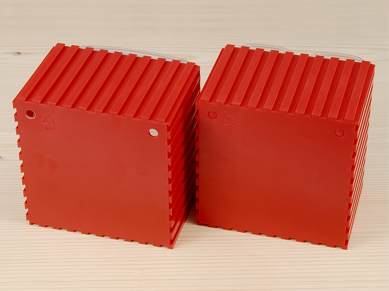 The walls of the boxes are equipped with dovetail grooves on the peripheral walls, which are used to assemble individual parts into assemblies. There are blind holes in the back wall that easily break through to create screw holes if needed. The casings are made of ABS material in red (RAL 3020) or blue (RAL 5015).