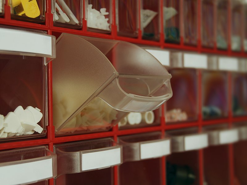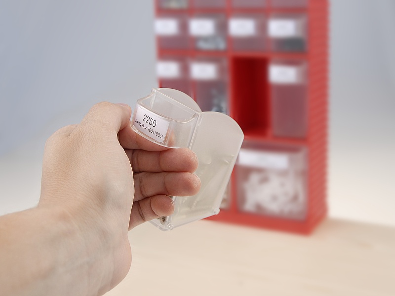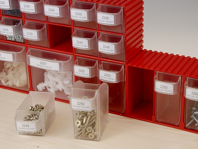 Each swing box has a transparent container. In some types of swing boxes it is tiltable, in others it is extendable. However, it is true for all that the container with the contents can be removed and freely manipulated as needed. Transparency enables easy and quick identification of stored components.