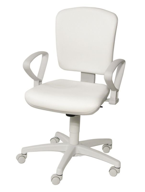 Medical swivel chair. Special chairs for surgeries, laboratories, classrooms and other workplaces that require a large seat and large back rests for longer sitting, easy to wash and for working at a table top approx. 760-900 mm high. Pleasant light gray plastic color. The chair meets the basic ergonomic requirements for adjusting its dimensions according to the current needs of the sitter. Adjustable dimensions: seat height, raster height and backrest inclination in 5 degrees, footrest height (independent of seat height).