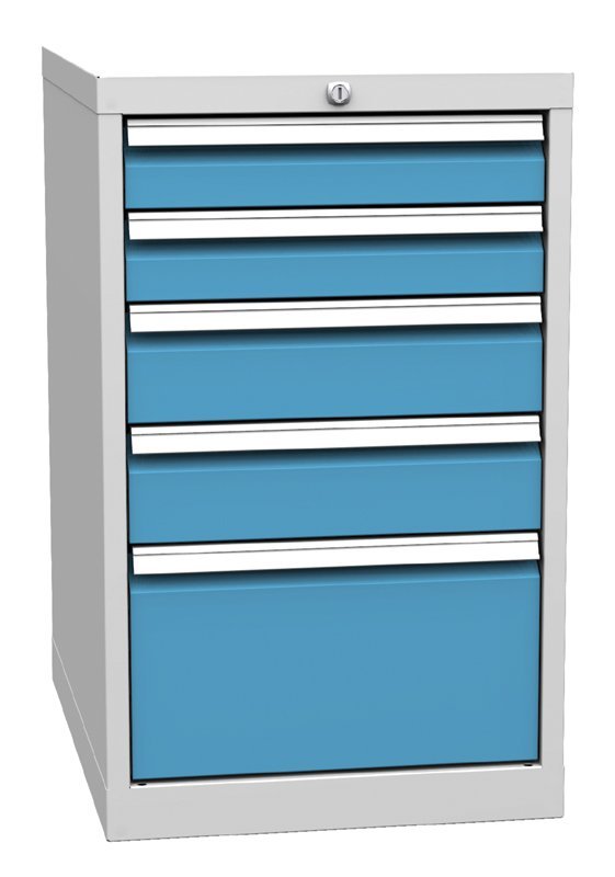 Five-drawer workbench container, width 500, height 810, depth 700 mm. 2x socket 90, 2x 120, 1x 240 mm. Body color RAL 7035 light gray. In stock in body color light gray, drawers blue.