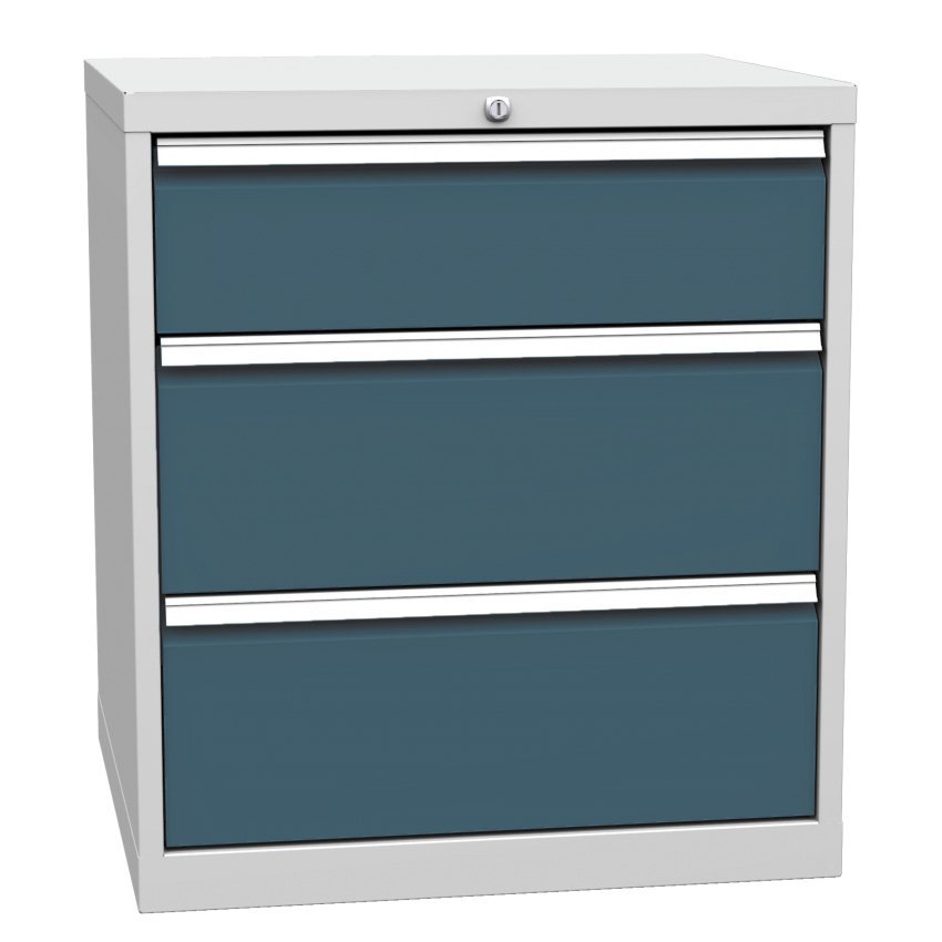 Three-drawer workbench container, width 500, height 810, depth 700 mm. 1x socket 180, 2x 240 mm. Body color RAL 7035 light gray. In stock in body color light gray, drawers blue.