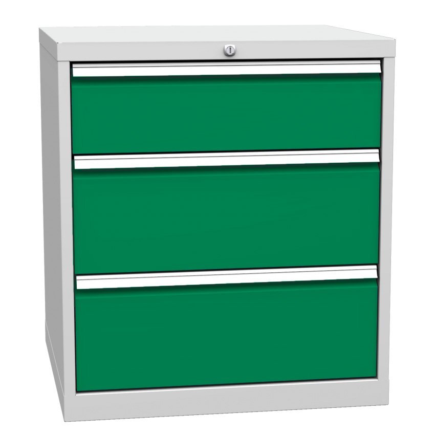 Three-drawer workbench container, width 720, height 810, depth 700 mm. 1x socket 180, 2x 240 mm. Body color RAL 7035 light gray.