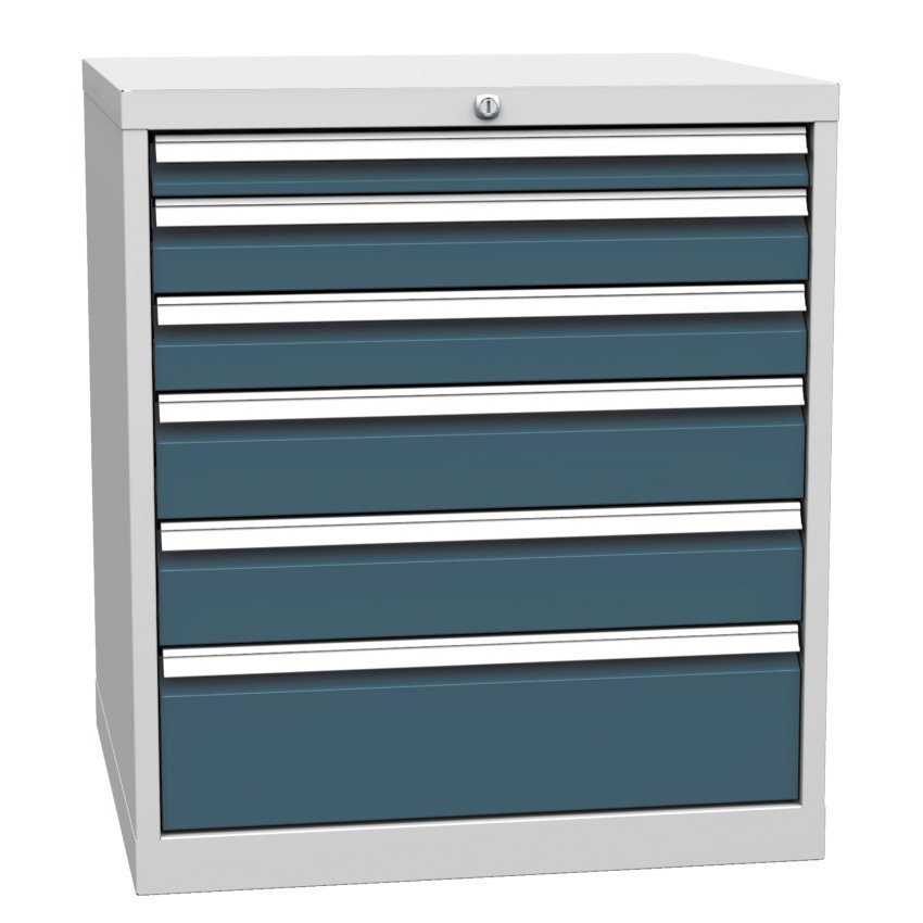 Five-drawer workbench container, width 500, height 810, depth 700 mm. 2x socket 90, 2x 120, 1x 240 mm. Body color RAL 7035 light gray. In stock in body color light gray, drawers blue.