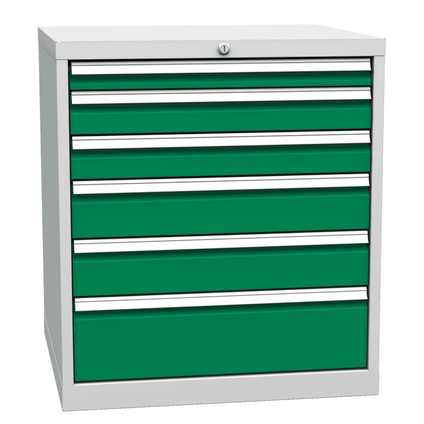 Five-drawer workbench container, width 720, height 810, depth 700 mm. 1x socket 60, 2x 90, 2x 120, 1x 180 mm. Body color RAL 7035 light gray.