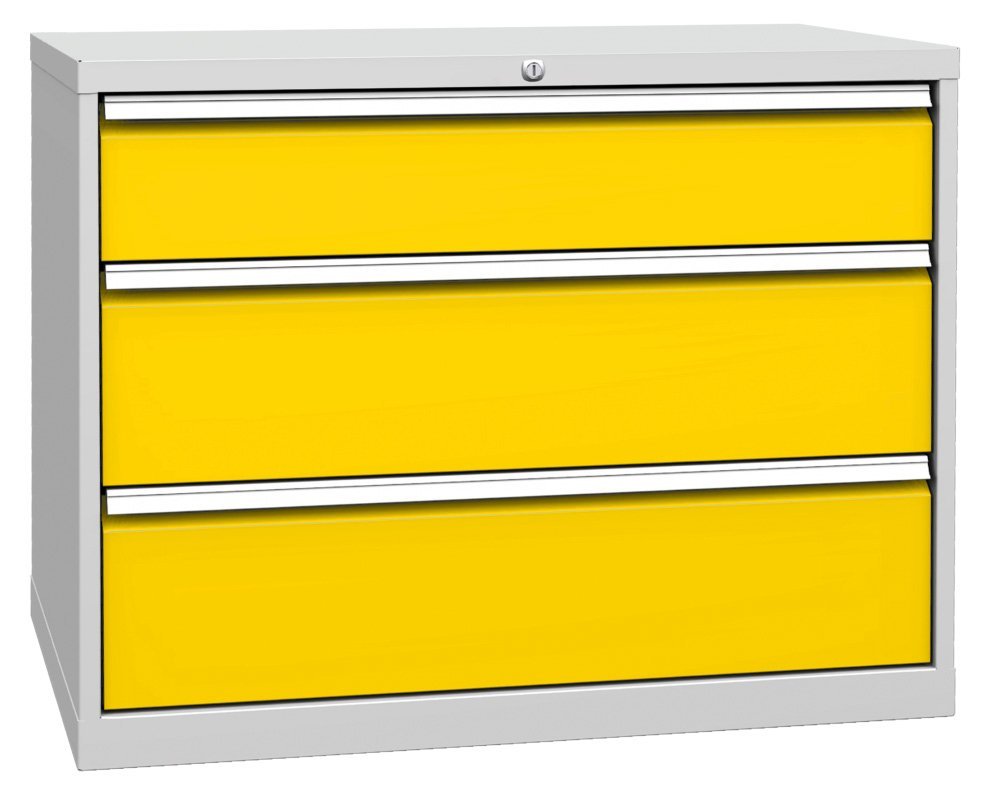 Three-drawer workbench container, width 1000, height 810, depth 700 mm. 1x socket 180, 2x 240 mm. Body color RAL 7035 light gray.