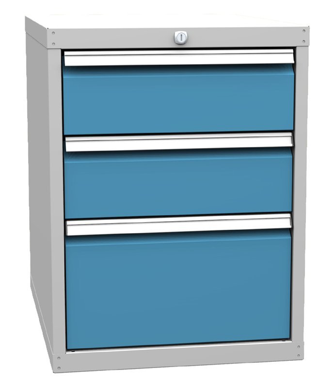 Three-drawer container DPP 02A, width 500, height 660, depth 700 mm. 2x socket 150, 1x 240 mm. Body color RAL 7035 light gray. full description and parameters