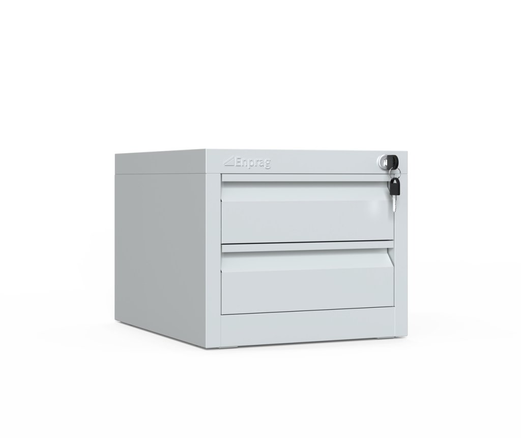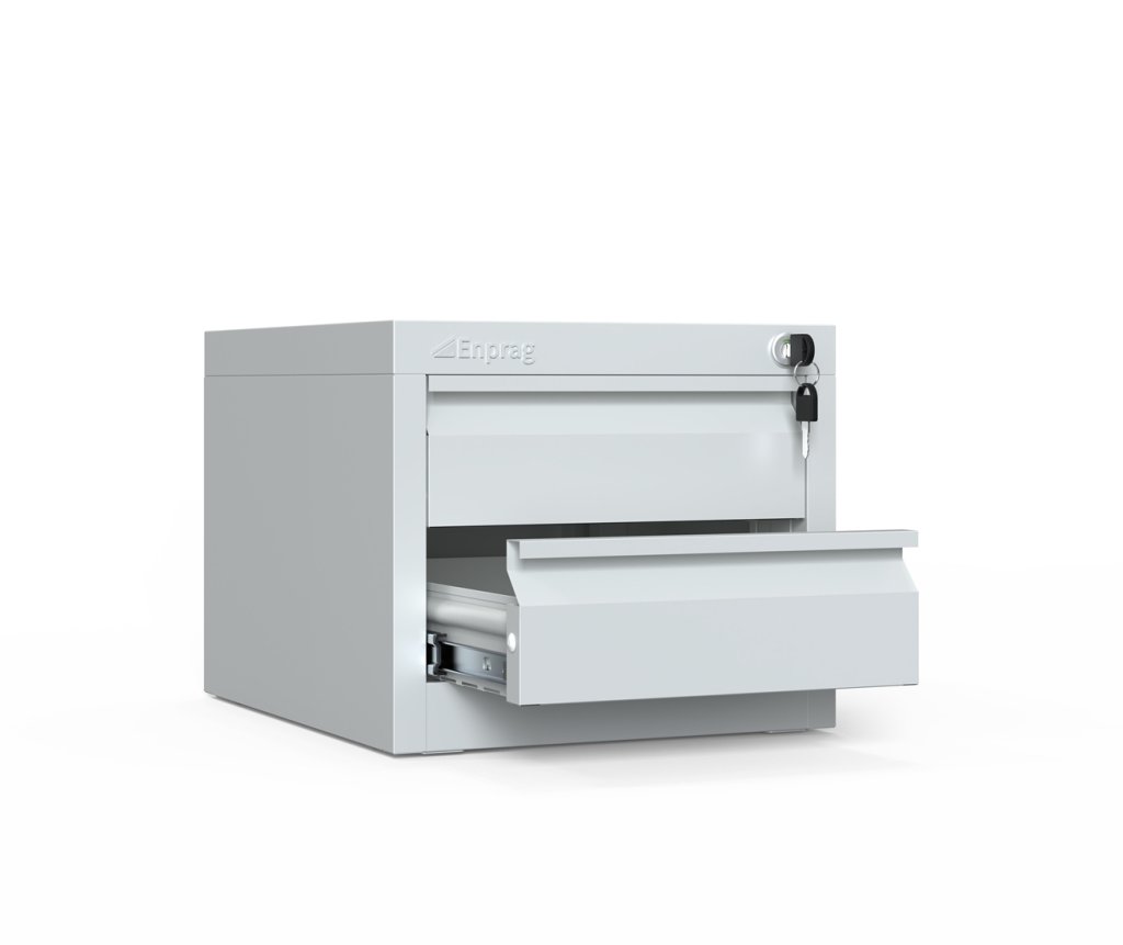 Hanging container with two drawers for a work table, height 280, width 565, depth 580 mm. 2x drawer, body color RAL 7035, drawer color RAL 5015.