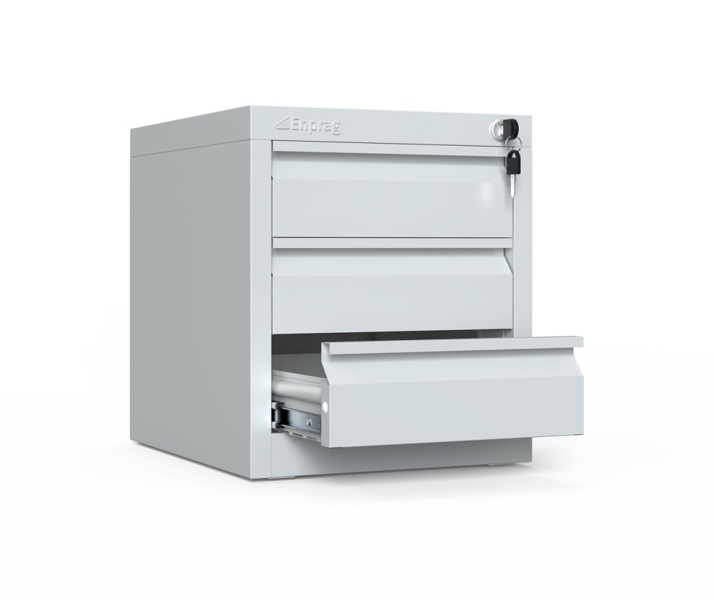 Hanging container with three drawers for a work table, height 380, width 500, depth 400 mm. 3x socket, color ESD gray RAL 7035.