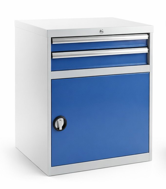 Two‑drawer workbench container with doors, width 717 mm, height 800 mm, depth 727 mm, with 1x drawer 75 mm, 1x drawer 100 mm, and 1 shelf. Body colour RAL 7035 light grey, drawer colour RAL 5012 blue.