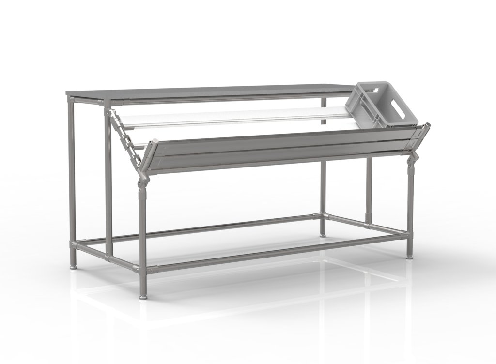 Universal table for crates. The color of the frame is selectable based on the tubes. With uniform loading, the load capacity is 150 kg. The table is suitable for e-shops, logistics centers, and warehouses. Dimensions: 829 x 1500 x 720 mm.