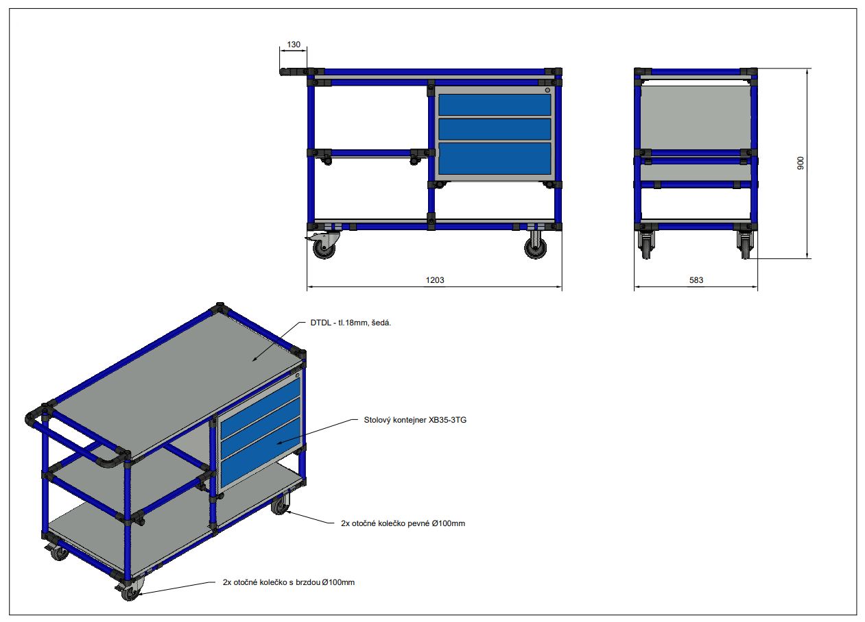 Workshop trolley made from a tubular modular system. This trolley is equipped with an 18 mm thick laminated chipboard that provides a solid and stable work surface. The cart includes four wheels with a diameter of 100 mm and a workshop three-drawer container XB35-3TG for practical storage of tools. Total load capacity 250 kg, floor load capacity 100 kg.