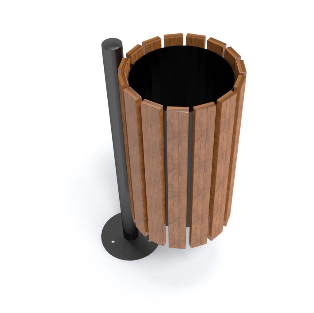 Round wooden trash can. Surface finish: baked paint or hot-dip zinc. Wood treated with 3 times glaze. The basket is equipped with a removable galvanized insert. Height 800 mm, diameter 400 mm, volume 60 l, weight 25 kg.