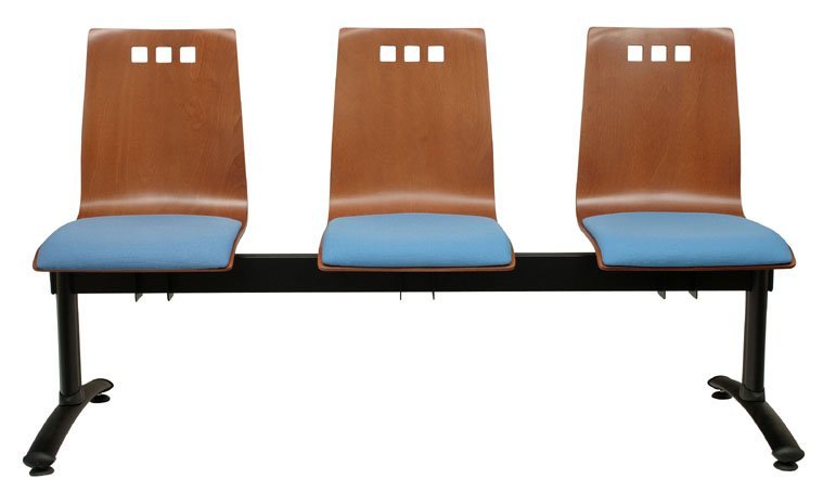 Waiting room bench for three people, washable leatherette cover. Length 150 cm, height 79 cm, depth 40 cm. Welded metal construction.