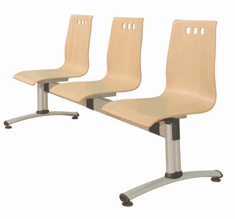 Berni five-seater, black or gray metal frame, total width 2600 mm. Beech plywood shell in several shades, possibility of upholstered seat and backrest panels.