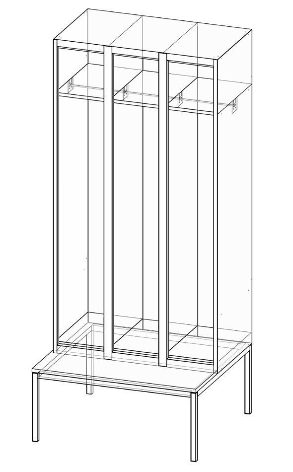 Three-door metal wardrobe with pedestal bench, width 750 or 900 mm, height 2080 mm, depth 500 mm, at the top of each compartment there is a shelf and a bar with three plastic hooks. Price without label for name tag.