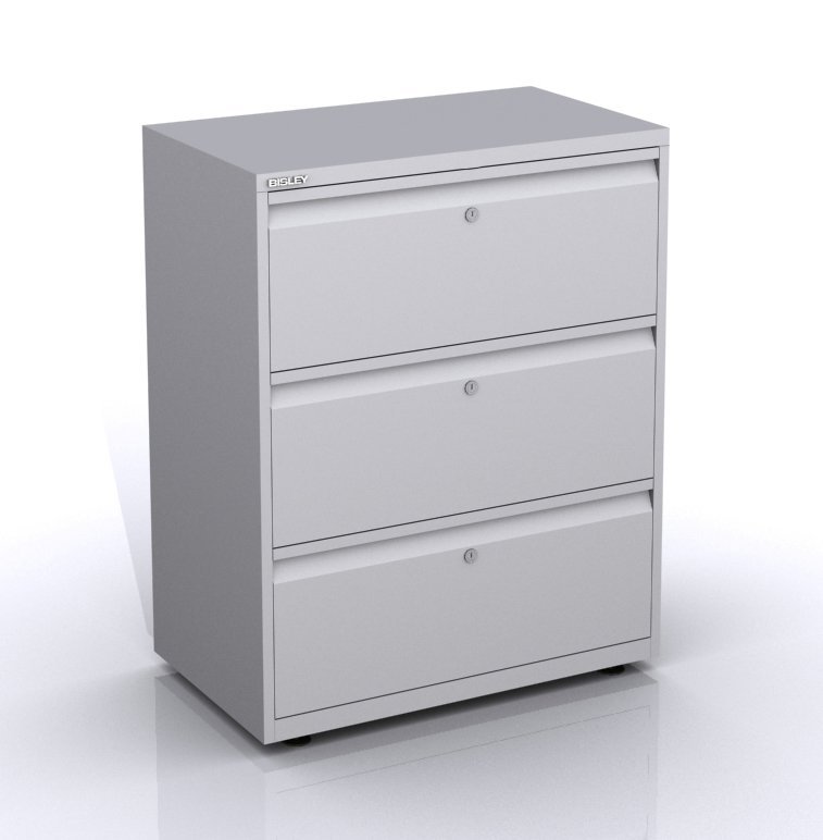High-quality three-drawer filing cabinet for storing A4 hanging files and Foolscap with individually lockable drawers. Width 800