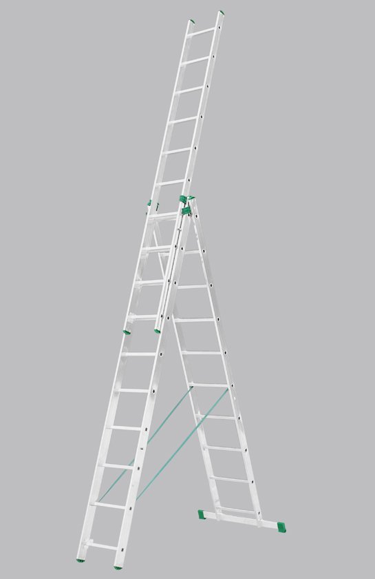 Three-part universal Eurostyle ladder. Number of partitions 3x9, max. extendable length 5.69m, width 454mm, green-black end caps. These ladders are made of lightweight materials with an emphasis on lightness and easy handling. Suitable for everyday use in the home and in companies. Maximum load capacity 150 kg.