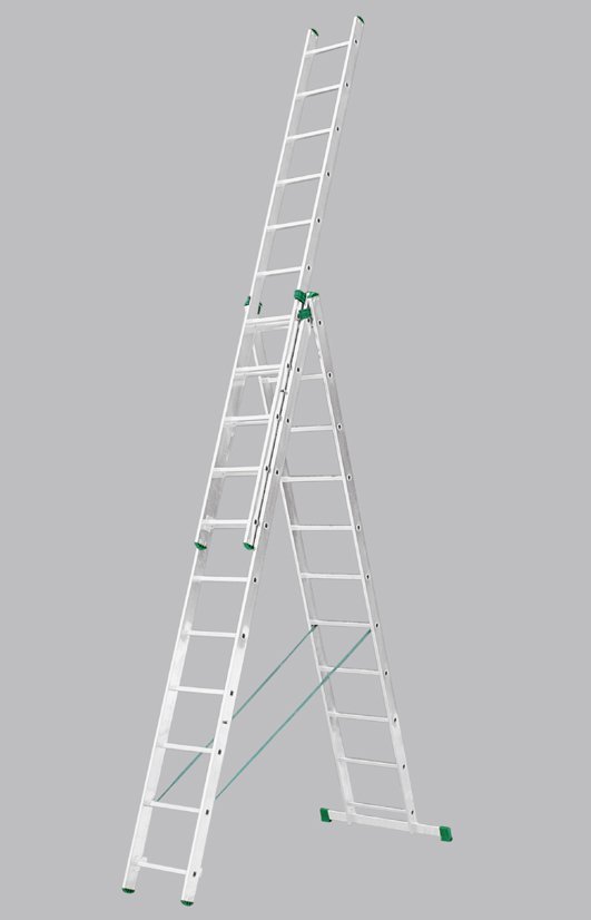 Three-part universal Eurostyle ladder. Number of partitions 3x9, max. extendable length 5.69m, width 454mm, green-black ends. These ladders are made of lightweight materials with an emphasis on lightness and easy handling. Suitable for everyday use in the home and in companies. Maximum load capacity 150 kg.