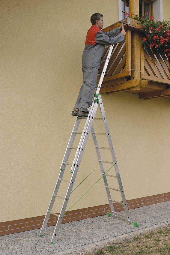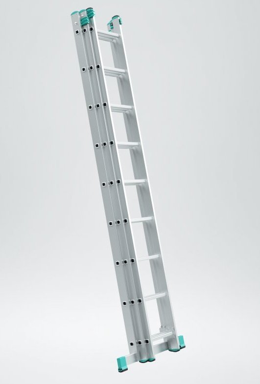 Three-part universal Eurostyle ladder. Number of partitions 3x9, max. extendable length 5.69m, width 454mm, green-black ends. These ladders are made of lightweight materials with an emphasis on lightness and easy handling. Suitable for everyday use in the home and in companies. Maximum load capacity 150 kg.