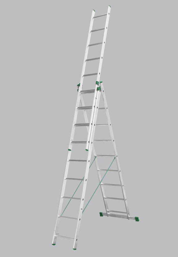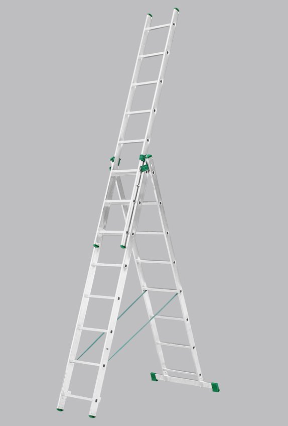 Three-part universal Eurostyle ladder. Number of partitions 3x10, max. extendable length 6.26m, width 454mm, green-black ends. These ladders are made of lightweight materials with an emphasis on lightness and easy handling. Suitable for everyday use in the home and in companies. Maximum load capacity 150 kg.