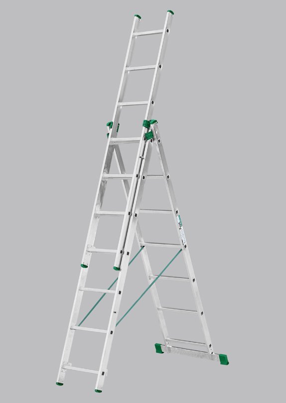 Three-part universal Eurostyle ladder. Number of partitions 3x9, max. extendable length 5.69m, width 454mm, green-black ends. These ladders are made of lightweight materials with an emphasis on lightness and easy handling. Suitable for everyday use in the home and in companies. Maximum load capacity 150 kg.