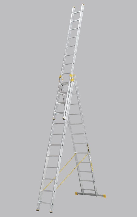 Forte three-piece universal ladder. Number of partitions 3x15, max. extendable length 11.20 m, width 484 mm, yellow-black ends. These ladders are made to meet high durability and reliability while keeping the weight as low as possible. Maximum load capacity 150 kg.