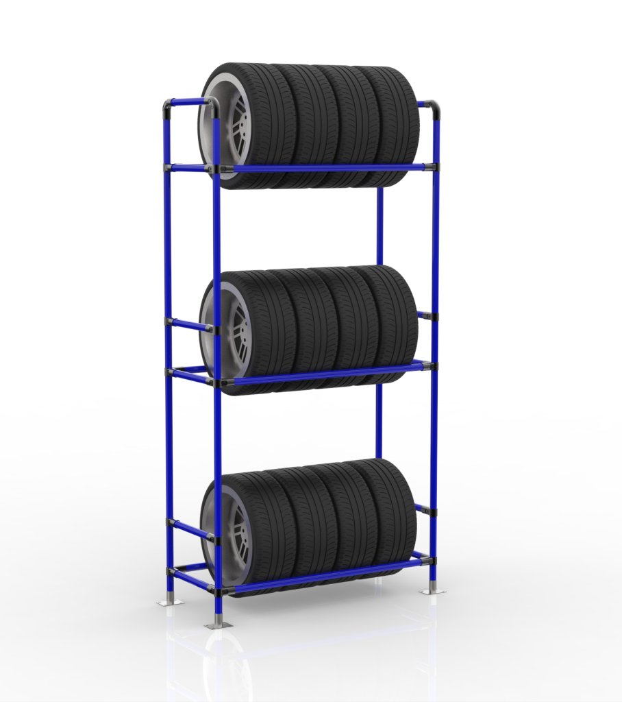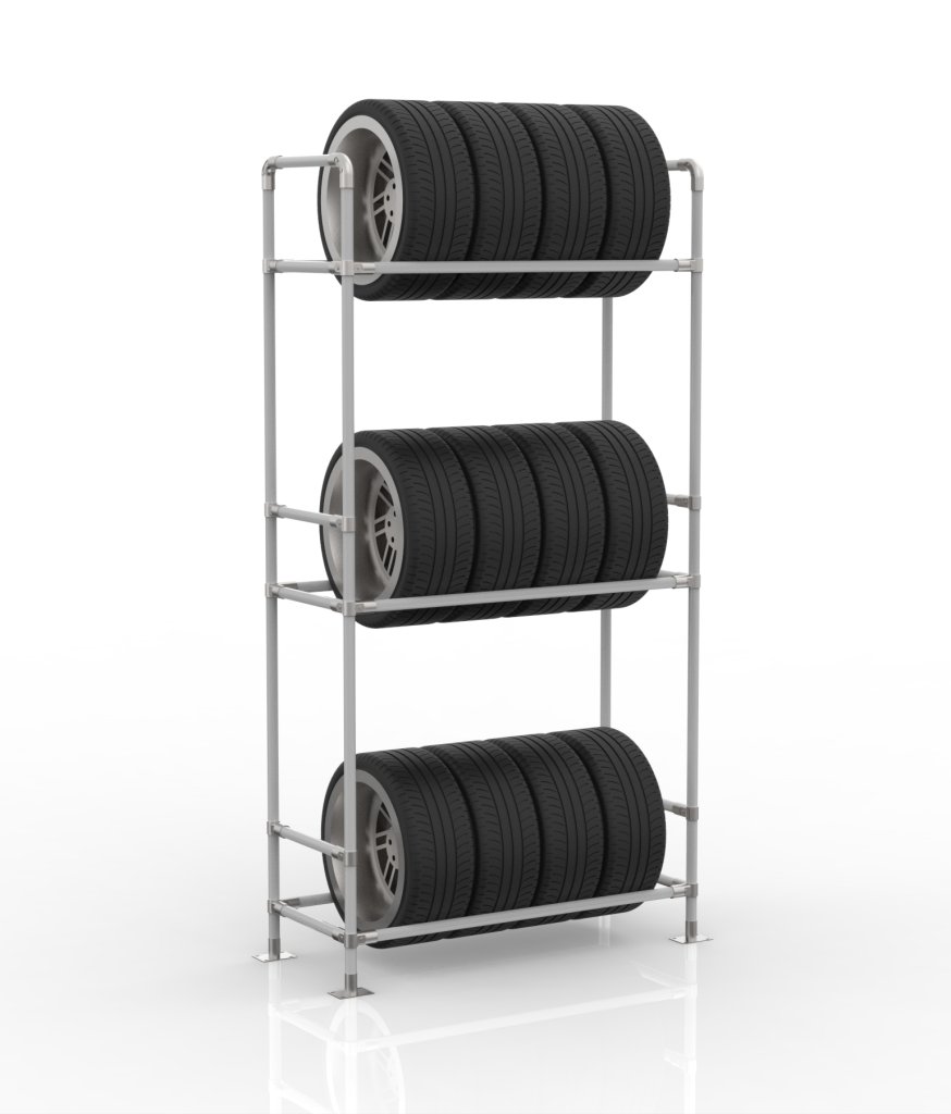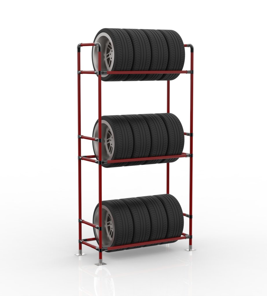 Mobile tire rack made from a tubular modular system with one shelf and two tiers. Ideal for tires measuring 16" to 20". The rack includes two tiers for tire storage, one shelf with a 10 mm thick Akyboard, a handle on each side for easier handling, two wheels with brakes, and two wheels without brakes, each with a diameter of 100 mm. Tires are not included. Load capacity of the shelf is 100 kg, total load capacity is 200 kg. Dimensions: 1500 x 1068 x 600 mm.