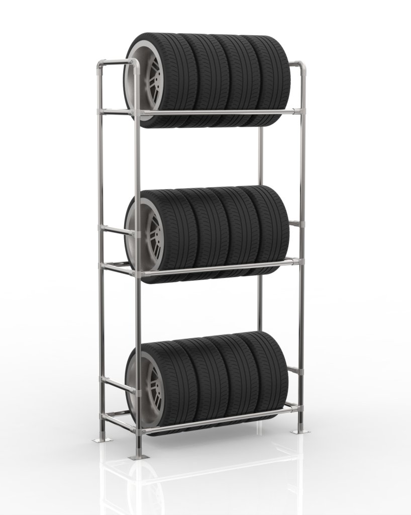 Tire stand made from a tubular modular system with three shelves. Practical storage for up to 12 tires on three levels. Ideal for tires measuring 16" to 20", the stand includes four anchoring feet. Tires are not included. Load capacity per shelf is 100 kg, total load capacity is 300 kg. Dimensions: 2000 x 1127 x 465 mm.