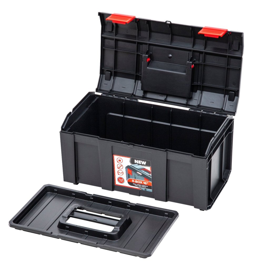 Practical plastic case for tools. Black color, ear and closure in red. Side handles. Organizer inside the trunk for better overview. Padlock hole. Dimensions (H x W x D) 219 x 395 x 240 mm.