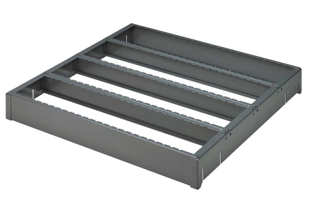Wooden holder for storing universal NC tools with auxiliary orientation grid for individual solutions. Size 54D, the overall dimensions of the holder (width x depth) are 855 x 142 mm, the number of positions is 164. The complete assembly of the wooden holder is stored in tool frames and tool carriers.