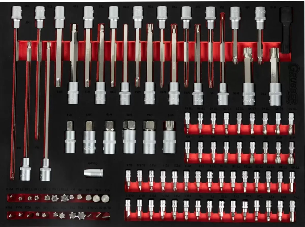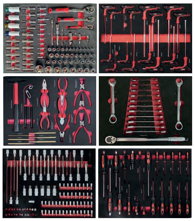 250-piece tool set in six foam inserts. For workshop trolley. Foam dimensions 530 x 390 mm. Red and black color combination of foam and tools.