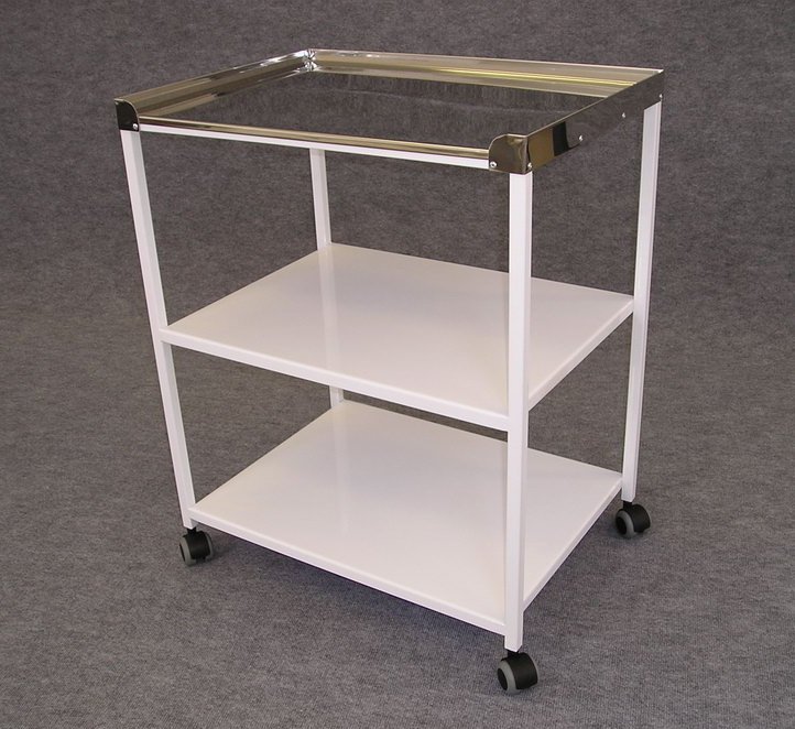 Mobile tool table type 47621. The tool table with stainless steel plate consists of a metal structure, which is surface treated with powder technology. The upper plate is made of stainless steel and the lower storage plates are made of sheet steel.
