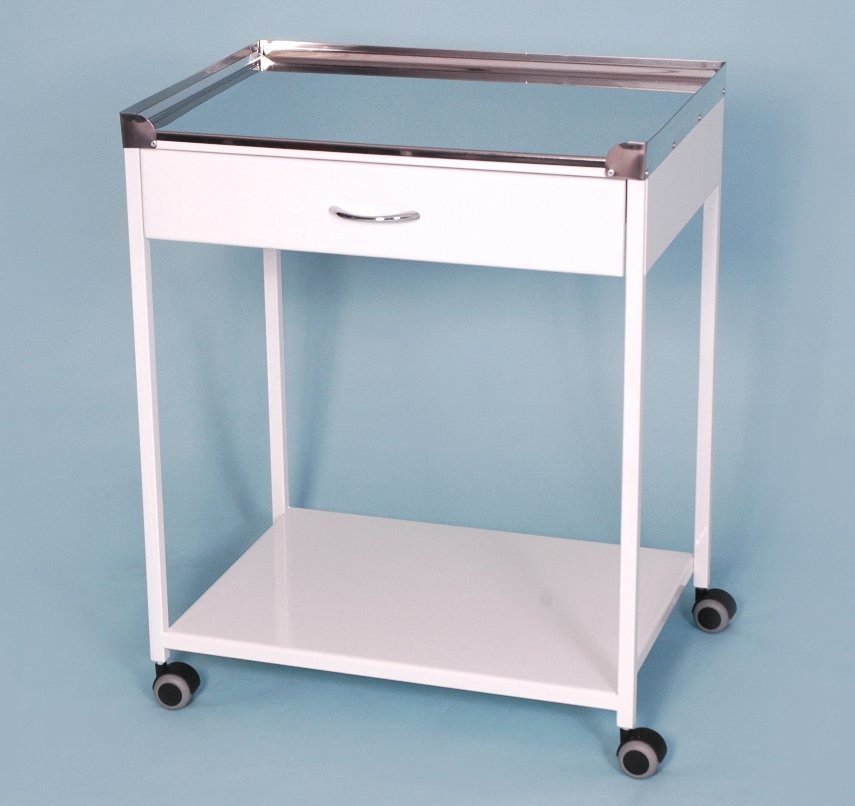 Mobile tool table type 47628. The tool table with stainless steel plate and drawer consists of a metal structure, which is surface-treated with powder technology. The upper plate is made of stainless steel and the lower storage plate is made of sheet steel.