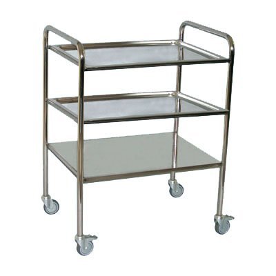 Movable side table. The metal structure is made of steel, with a surface treated by powder technology. It consists of three shelves with a border, on the top shelf there is a handle for easy handling. The shelves are filled with white acrylic, the load capacity of the shelf is 50 kg.