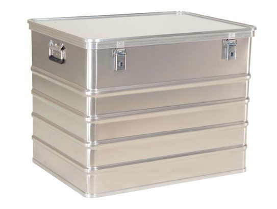 Universal stackable crates made of high quality aluminum alloy. Structured, highly scratch-resistant surface. Hinged lid with rubber seal. Lid removable if needed. One folding handle from the front. Various sizes, volume 42 - 150 l.
