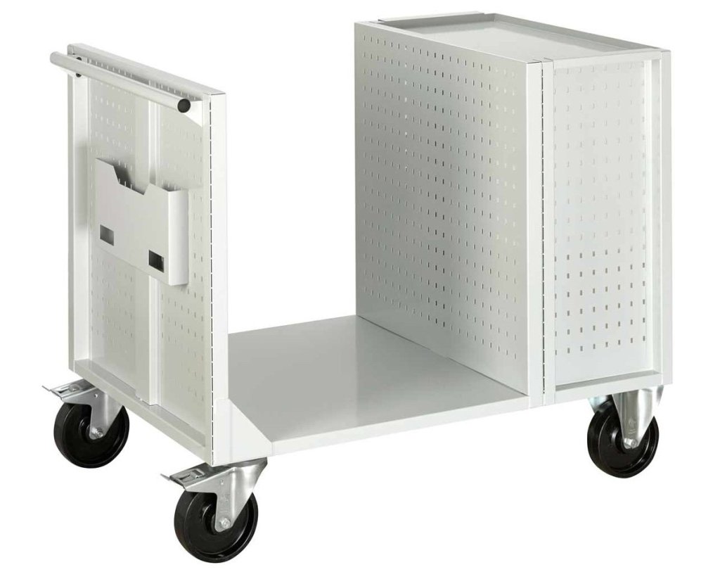 Transport NC trolley - The basic structure of the trolley is made of high-quality reinforced steel sheet welds, the side walls are perforated for hanging carriers or tool frames. The trolley is equipped with two swivel wheels with a brake and two fixed wheels with a diameter of 160 mm.