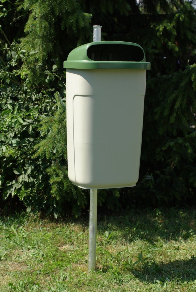 A very widespread and popular trash can throughout Europe. Simple handling for emptying containers using the handling handle. Stainless steel plate for extinguishing cigarette butts. 100% recyclable PE material, colorfast. Possibility of fixing the trash can on a metal post or on the wall. Content 50 l.