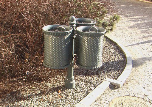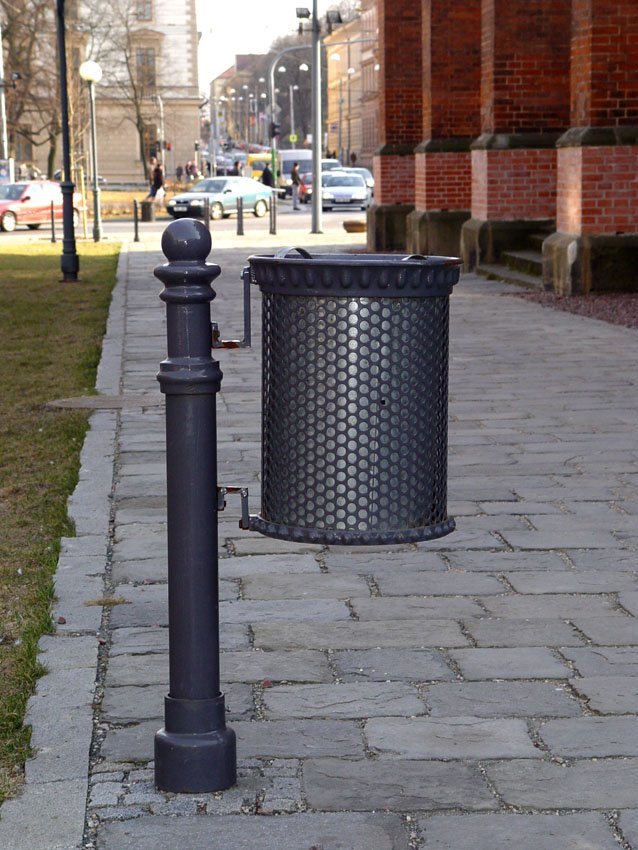 Waste bin for outdoor spaces. Made of solid cast iron with a steel web. The waste container is made of galvanized sheet steel. To be fixed in the ground. Height 1100 mm, volume 60 l, weight 70 kg. Warranty 2 years.