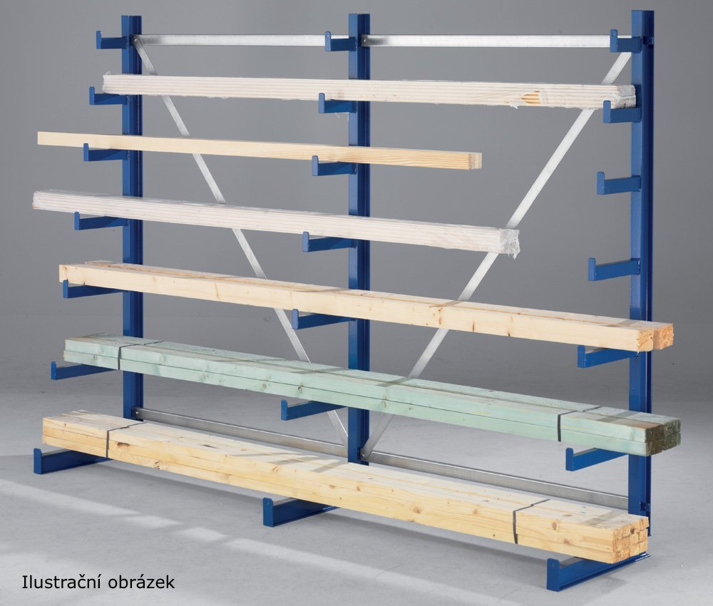 One-sided ATLAS ST cantilever rack with different arm lengths. Number of arms 6 per web, number of webs 6. Rack height 2000 mm, full description and parameters