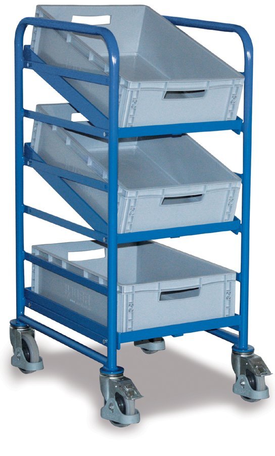Truck for transporting Euro crates. Welded steel construction, 3 open shelves. Slope 17° or 32°. Powder coating 5010 blue. 4 swivel castors with foot protection, 2 of them with brakes. Dimensions: height 1125 x width 520 x depth 665 mm. Storage area 410 x 604 mm.