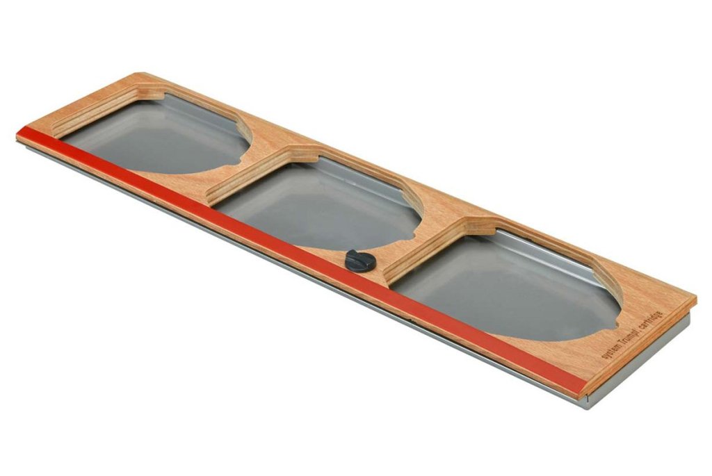 Wooden holder for storing punching tools of the Trumpf system. Size 36D, the overall size of the holder (width x depth) is 550 x 142 mm, the number of positions is 3. The complete assembly of the wooden holder is stored in tool frames and tool carriers.