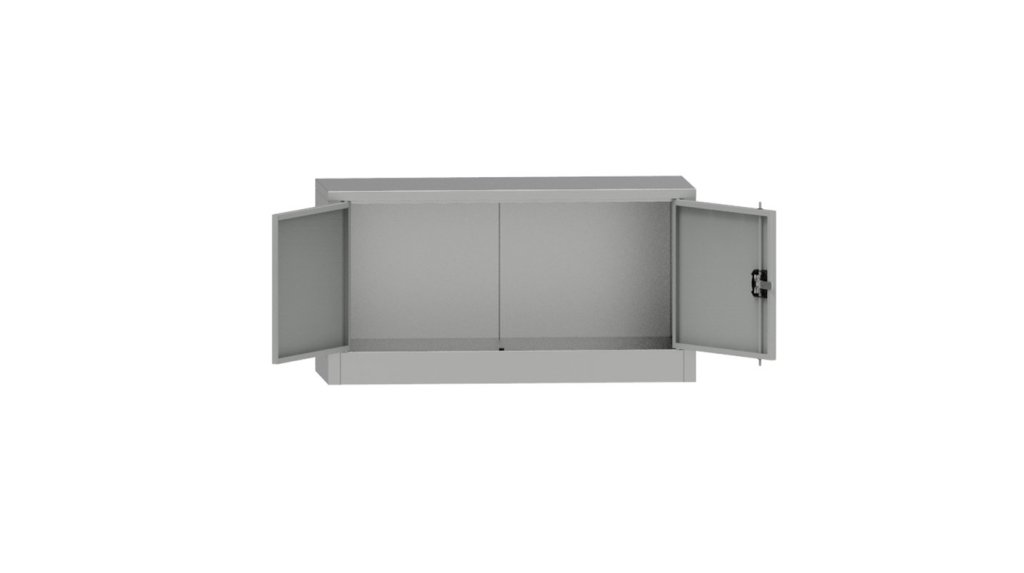 Two-door filing cabinet. Height 1150 x width 950 x depth 400 mm, 2 shelves. Wheelbase lock. Body color RAL 7035 light gray. It is delivered disassembled - easy assembly.