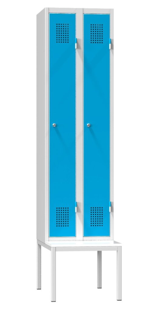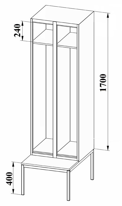 Two-door metal wardrobe with bench, width 500, 600 or 800 mm, height 2080 mm, depth 500 mm, at the top of each compartment there is a shelf and a bar with three plastic hooks. Price without label for name tag.