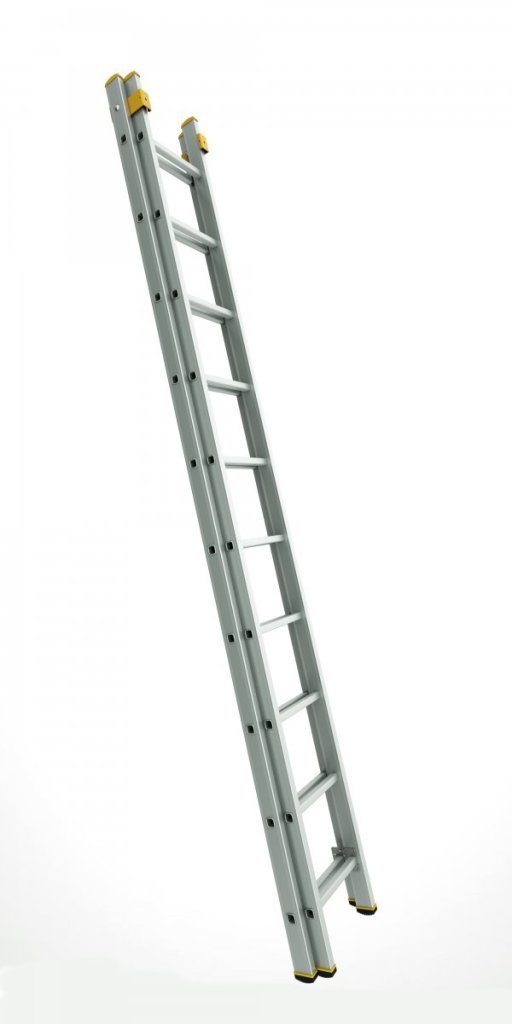 Two-part extendable ladder Forte. Number of partitions 2x18, max. extendable length 9.49 m, width 484 mm, yellow-black ends. These ladders are made to meet high durability and reliability while keeping the weight as low as possible. Maximum load capacity 150 kg.