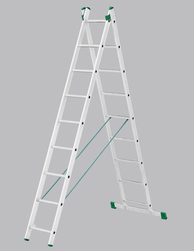 Two-part Eurostyle universal ladder. Number of partitions 2x9, max. extendable length 4.28m, width 397mm, green-black ends. These ladders are made of lightweight materials with an emphasis on lightness and easy handling. Suitable for everyday use in the home and in companies. Maximum load capacity 150 kg.
